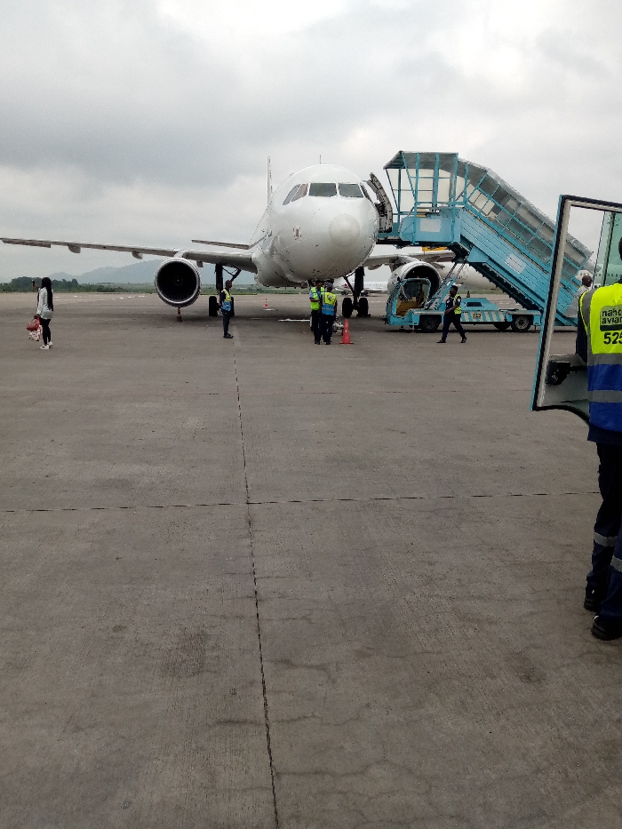 An overhead-lit scene at an airport apron in Gwaska, Nigeria, depicts a white passenger jet, likely an Airbus A320 series, stationary on a concrete surface. The aircraft's forward left passenger door is open, with a sky-blue mobile boarding stair positioned against it. Multiple ground crew personnel are visible: three are clustered near the aircraft's nose, wearing yellow-green high-visibility vests over blue uniforms. One crew member in a similar uniform walks towards the right side of the frame, away from the aircraft. Another crew member, partially visible in the extreme foreground right, wears a yellow "nahco avian 525" vest and blue uniform trousers. A female individual, identified as a passenger, stands on the left side of the frame, facing away from the aircraft, carrying a light-colored handbag and a red bag. Orange traffic cones mark the area near the aircraft's nose gear. The background reveals distant green hills or mountains under an overcast, grey sky.