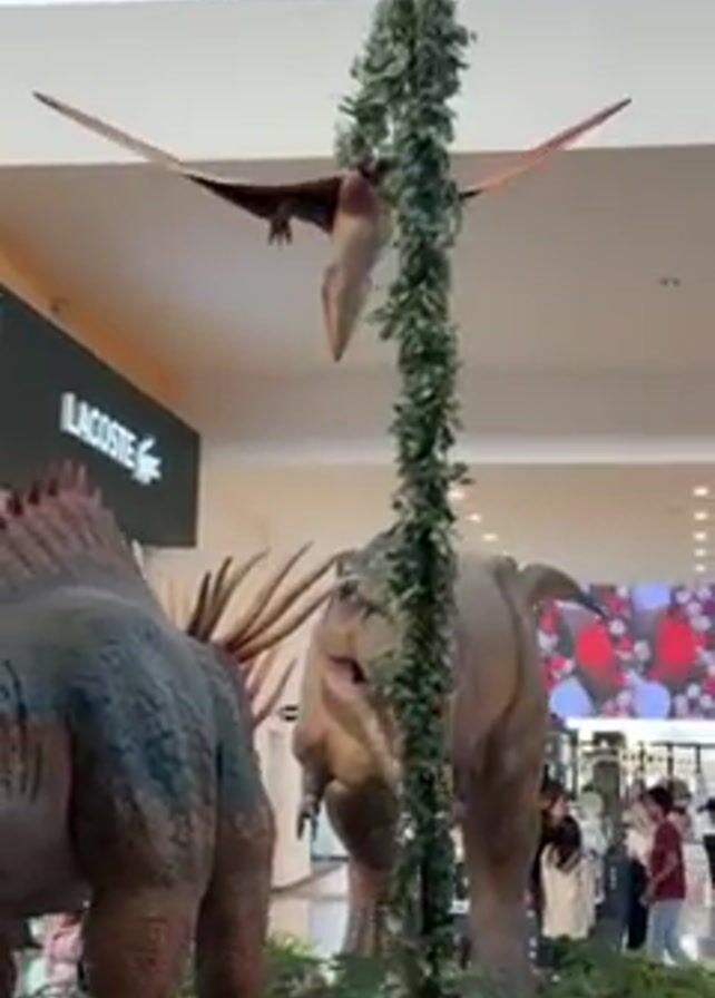 The scene captures a static display of dinosaur models inside a shopping mall. In the foreground, a Spinosaurus model is positioned with its distinctive sail-like structure. Behind it, a Tyrannosaurus Rex model stands with its mouth open, displaying its teeth. Between the two dinosaurs, a tall pole wrapped in artificial foliage stands. At the top of the pole, a Pterodactyl model is suspended. In the background, the recognizable logo for the clothing brand Lacoste is visible, along with a large advertisement with red and white imagery. Several mall patrons stand near the display, casually observing and taking pictures. The mall environment is well-lit, with a high ceiling and a modern architectural design.