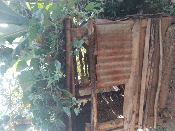 A weathered, rustic structure stands amidst lush greenery. Corrugated metal siding shows signs of rust. Wooden planks and branches form a frame, providing partial enclosure. Chicken wire is visible. Vines with large leaves and small white flowers crawl over the structure, blending it into the surrounding vegetation. A glimpse of green foliage hints at a thriving natural backdrop. The scene evokes a sense of rural simplicity and natural integration.