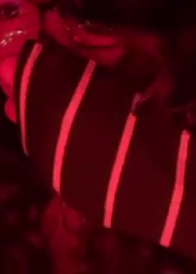 A person wearing glasses and a striped shirt is visible in a red-lit environment. Their face is partially obscured by their hand and the angle of the camera. The lighting is predominantly red, with some lights reflected in the glasses.