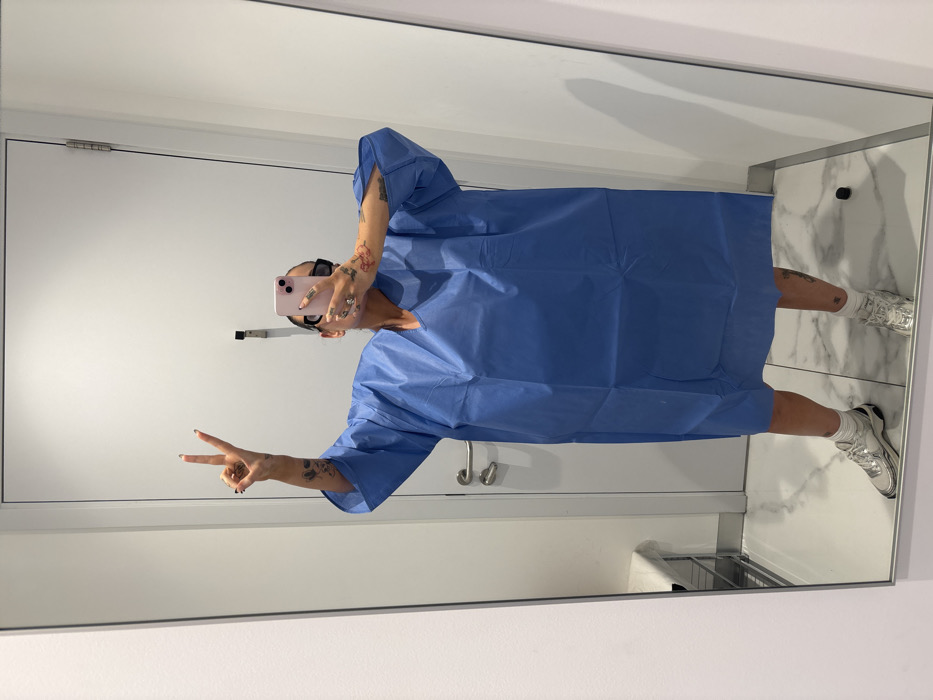 A full-length mirror selfie captures an individual in what appears to be a medical facility located in the city of Dubai, United Arab Emirates. The person, positioned centrally, is wearing a blue disposable medical gown, white socks, and silver and white athletic sneakers. Their face is obscured by a pink smartphone, held in the right hand for the purpose of taking the photograph. Dark rectangular sunglasses are worn over the eyes. The individual's left hand is raised, forming a 'V' peace sign. Visible tattoos are present on both arms, hands, and legs. Multiple rings are worn on the fingers of the right hand. The background consists of plain white walls, a white door with a silver handle to the left of the individual, and a white marble-patterned floor. In the reflection, a small white bench or examination table is partially visible to the far left. A small, dark, circular object rests on the floor to the right of the individual's feet.
