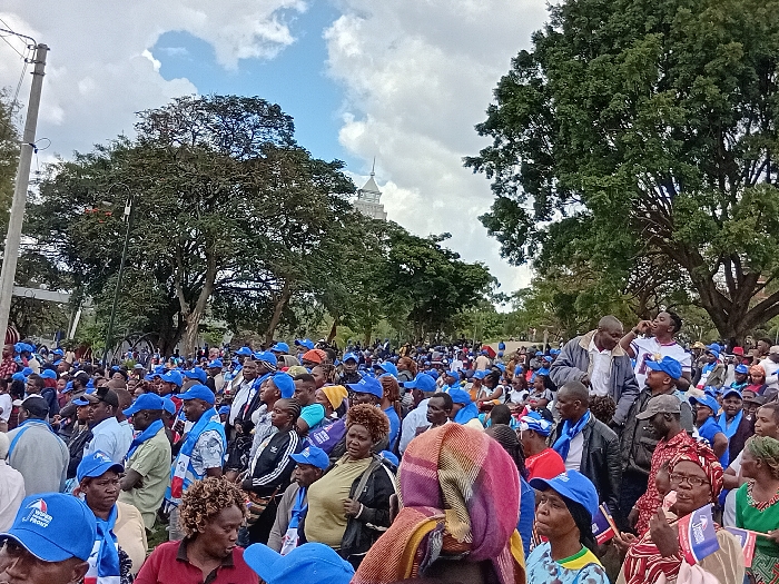 The image captures a dense outdoor gathering of several hundred individuals, predominantly adults of Black African ethnicity, likely attending a political rally or event