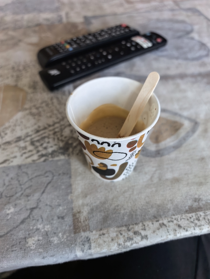 The image depicts an indoor scene focused on a white disposable paper cup containing a light brown liquid, consistent with espresso or coffee, topped with a thin layer of crema. A light-colored wooden stir stick is submerged vertically within the liquid. The cup's exterior features an abstract, repeating pattern of organic shapes and dashes in shades of brown, orange, and black. In the blurred background, two black remote controls are visible, lying parallel on a surface. The objects rest on a patterned surface, likely a tablecloth or countertop, exhibiting a mosaic or patchwork design in various shades of gray, white, and beige. No individuals are present or discernable, nor are any specific actions or interactions depicted. The environment appears to be a casually arranged indoor setting. The specific location within Varna, Bulgaria, cannot be determined from the visual information provided in the image.