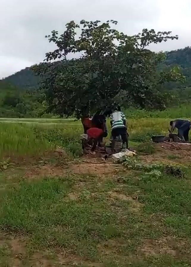 In a field with patches of brown dirt and green grass, four people stand beneath the shade of a large tree. The individuals appear to be interacting with something on the ground, possibly preparing food. Behind them, a field of tall green grass extends towards a slightly elevated area with scattered trees, and further in the background is a small mountain. The sky is overcast with a mix of clouds. The camera pans to the right, showing more of the green field and the tree-covered area behind it.