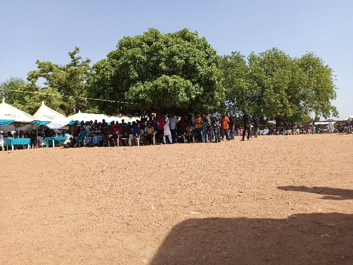gathering of people in Zum, Nigeria, a town located at the coordinates 10.116 latitude and 13.046 longitude. The gathering is taking place in an open, sandy field, with a large tree providing shade for a portion of the group. Several white tents are set up in the background, and the majority of people are seated on chairs or the ground. A few people are standing, interacting with each other, and some are walking away from the group. The scene suggests a social gathering, potentially a meeting or event. The environment is sunny and dry, typical of the African savanna climate.