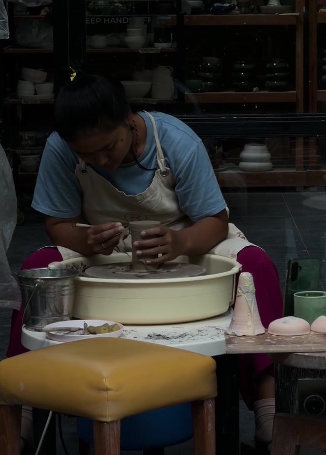 - "A medium shot shows a woman throwing pottery in front of a shop" by FM-kNLQJ2, licensed under CC BY 4.0