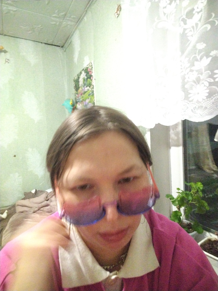 An individual is depicted in a medium shot indoors, located in Дойная, Russia. The person, with dark, centrally-parted hair, wears large gradient pink-to-purple tinted sunglasses, a magenta top with a white collar, and a silver-toned necklace. Motion blur is present across the face and the subject's partially visible right hand. The background features light green walls; a section on the upper left exhibits a subtle embossed pattern. A small, colorful picture depicting a landscape and a light-blue decorative object are affixed to the left wall. A white, lace-patterned curtain covers a window on the right, with a green potted plant visible on the windowsill. A folded beige fabric object is visible behind the subject's left shoulder.