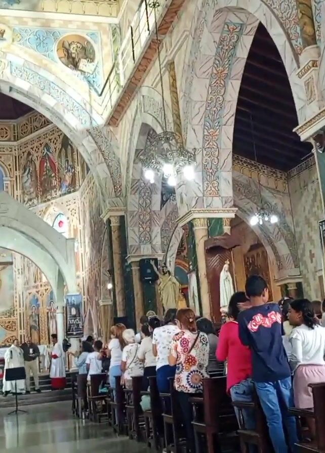 interior of a church filled with people. The walls and arches are elaborately decorated with paintings and patterns. A crucifix is visible at the altar. People are standing and some are turning to look towards the camera. The lighting is provided by chandeliers and some natural light filtering through stained glass windows.