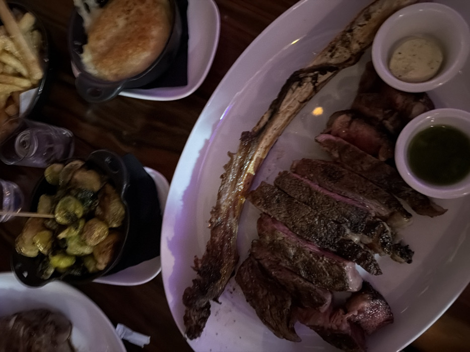 A top-down shot reveals a lavish meal. A large, bone-in steak, pre-sliced, dominates a white platter, accompanied by two small bowls of dipping sauces. Sides of mac and cheese, french fries, and roasted Brussels sprouts in small, dark bowls are also visible. The meal sits on a dark, possibly wooden, surface.