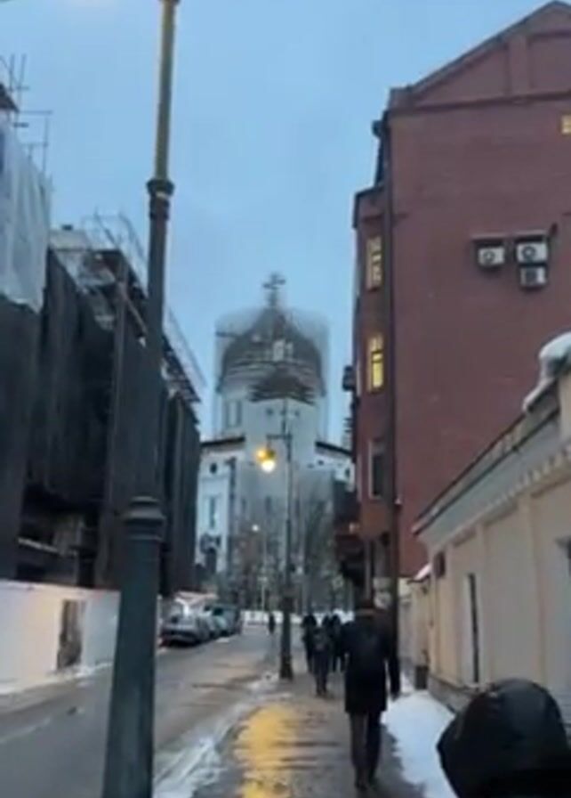 pedestrian perspective of a street scene on a grey day. The street is lined with buildings; on the left, a building shrouded in black tarps and scaffolding and, on the right, a red brick building with a white wall in front of it. A line of people walks towards a large, white building with a prominent dome in the distance, which also appears to be under construction and surrounded by scaffolding. A black lamppost stands in the foreground, with a single illuminated globe. Patches of snow are visible along the edge of the street. A construction crane is visible in the top left corner of the frame. The street itself appears wet or icy, reflecting the light from the lamppost.
