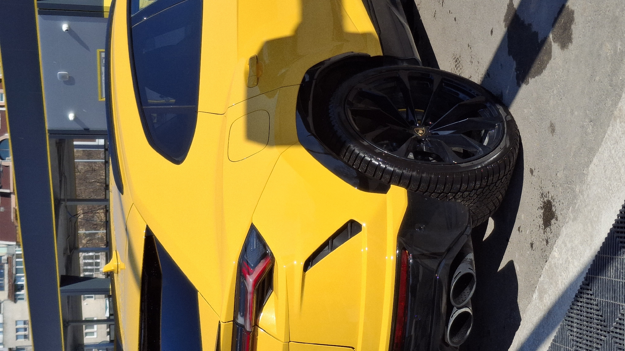 rear of a bright yellow Lamborghini Urus parked on a concrete surface