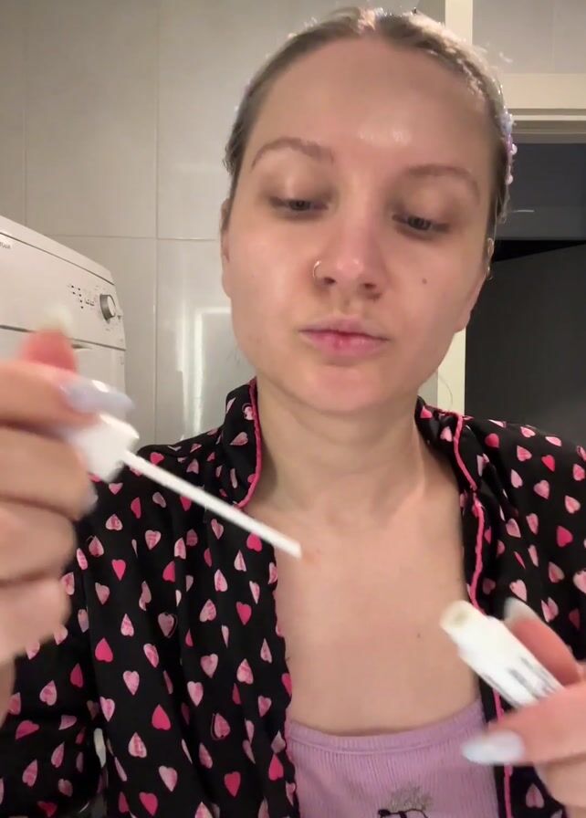 A woman stands in a bathroom, applying a product to her upper eyelid with an applicator wand. She is wearing a black pajama top with pink hearts, and her hair is pulled back with a colorful headband. A washing machine is visible in the background.
