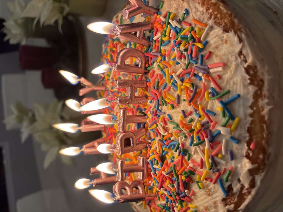 A frosted cake is covered with colorful sprinkles and lit by candles spelling out "HAPPY BIRTHDAY"