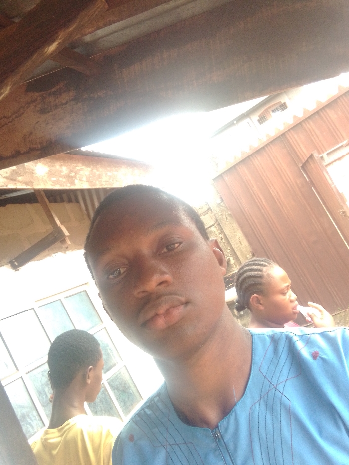 The image displays three individuals in Ukwu-Abwa, Nigeria, situated under an overhead structure consisting of wooden beams and a corrugated metal roof, with strong sunlight causing overexposure in the upper-center. In the foreground, a young Black male with short dark hair directly faces the camera, wearing a light blue traditional Nigerian garment with black embroidered patterns. His expression is neutral. To his immediate left and slightly behind, another individual, possibly male, is visible from the back, wearing a yellow t-shirt, with a multi-paned window behind them. To the right of the foreground subject, a young Black female with braided hair pulled back is seen in profile, facing towards the right. She is holding a translucent object near her face. Behind her is a reddish-brown textured wall, possibly corrugated metal.