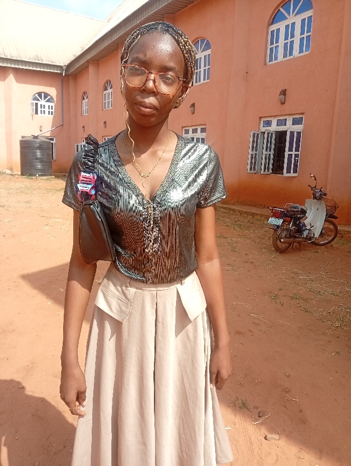 The image portrays a young adult female standing outdoors in Nsukka, Nigeria, under daylight