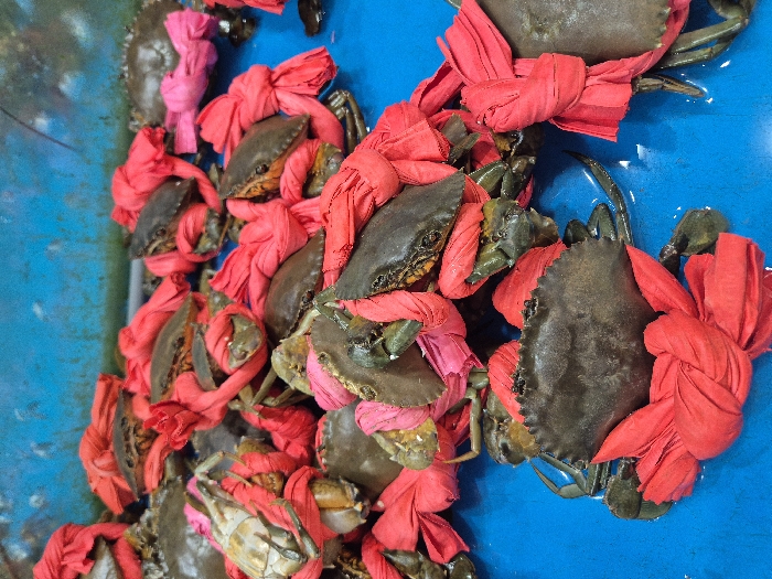 A close-up shot reveals a collection of mud crabs tied with red and pink cloth
