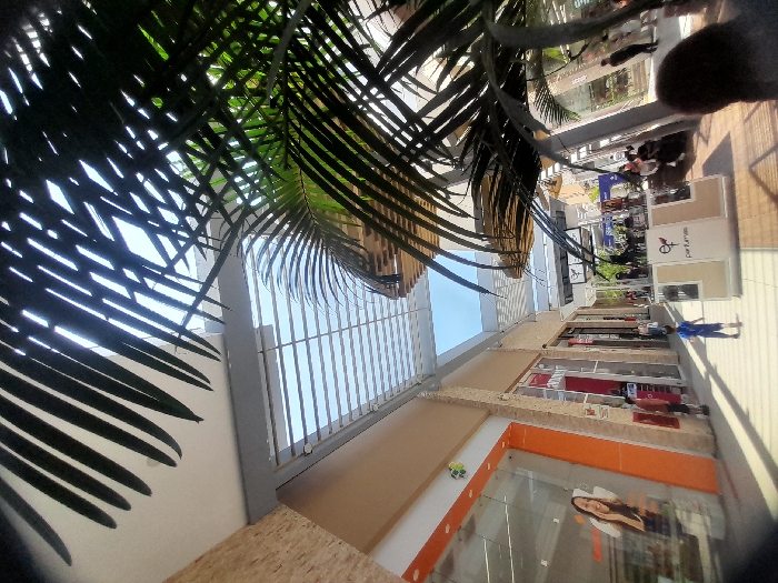 - "A sideways view from beneath palm fronds reveals a sunlit outdoor shopping mall" by FM-oKDhM2, licensed under CC BY 4.0