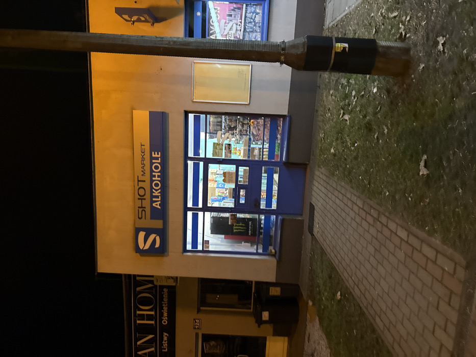 The image displays a nighttime street scene in Tarnów, Poland, specifically adjacent to Krakowska 12D. A single-story commercial building, illuminated by internal and external lighting, occupies the central frame. Its facade is light-colored stucco, topped by a blue and yellow sign reading "SHOT MARKET" and "ALKOHOLE" with a stylized 'S' logo. The storefront consists of blue-framed glass windows and a central entrance door, through which various retail items, including beverages and packaged goods, are visible. A black "MONSTER" energy drink cooler is discernible inside the left window. To the immediate left, a darker, unlit building with the address "12d" visible, features partial signage that reads "RAN HOME Listwy Oświetlenie." Two dark, lidded trash bins are positioned outside this adjacent building. A paved walkway constructed of light brown rectangular bricks leads directly to the "SHOT MARKET" entrance. This walkway is bordered by patches of sparse grass containing scattered fallen leaves. On the far right, a dark utility pole with a black, hexagonal base stands within the grassy area. The sky above is dark, indicating a nighttime environment. No individuals are present within the depicted scene.