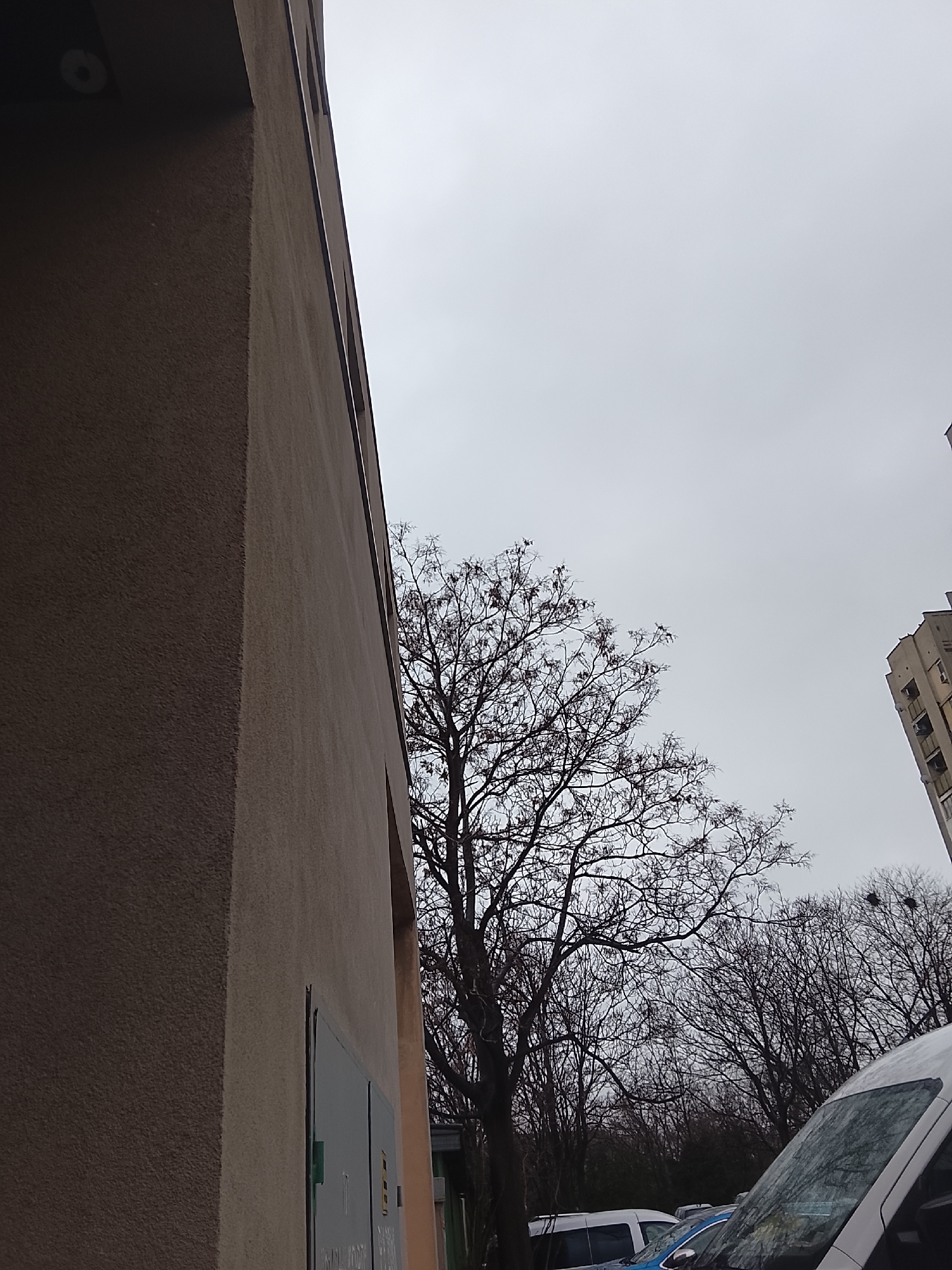 The image presents an urban scene, possibly in Plovdiv, Bulgaria, judging by the architectural style. A corner of a brown building dominates the left side. The sky is overcast and grey. A deciduous tree with bare branches is centrally located, its branches reaching towards the top of the frame. In the distance, a taller building with multiple stories is partially visible. Several cars and vans are parked in the foreground, including one with a prominent white roof reflecting the overcast sky. The overall impression is one of a grey, urban landscape in the late autumn or winter season.