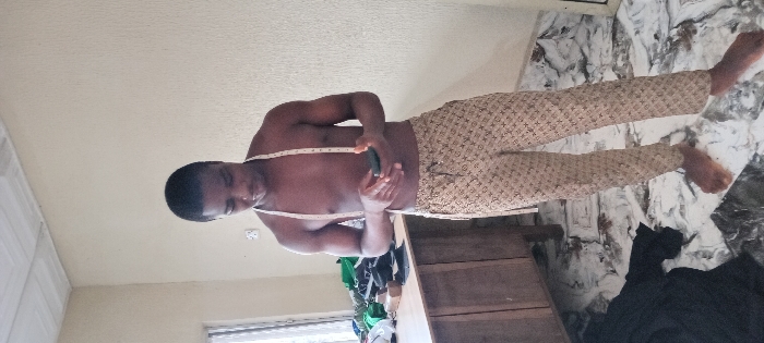 A man with dark skin is shirtless and wearing patterned pants. He has a measuring tape around his neck and shoulders, and he is holding a phone in his hands, appearing to take a photo. The background includes a white ceiling and walls, a marble-patterned floor, a wooden dresser, and various items on top of the dresser. The image is slightly angled.