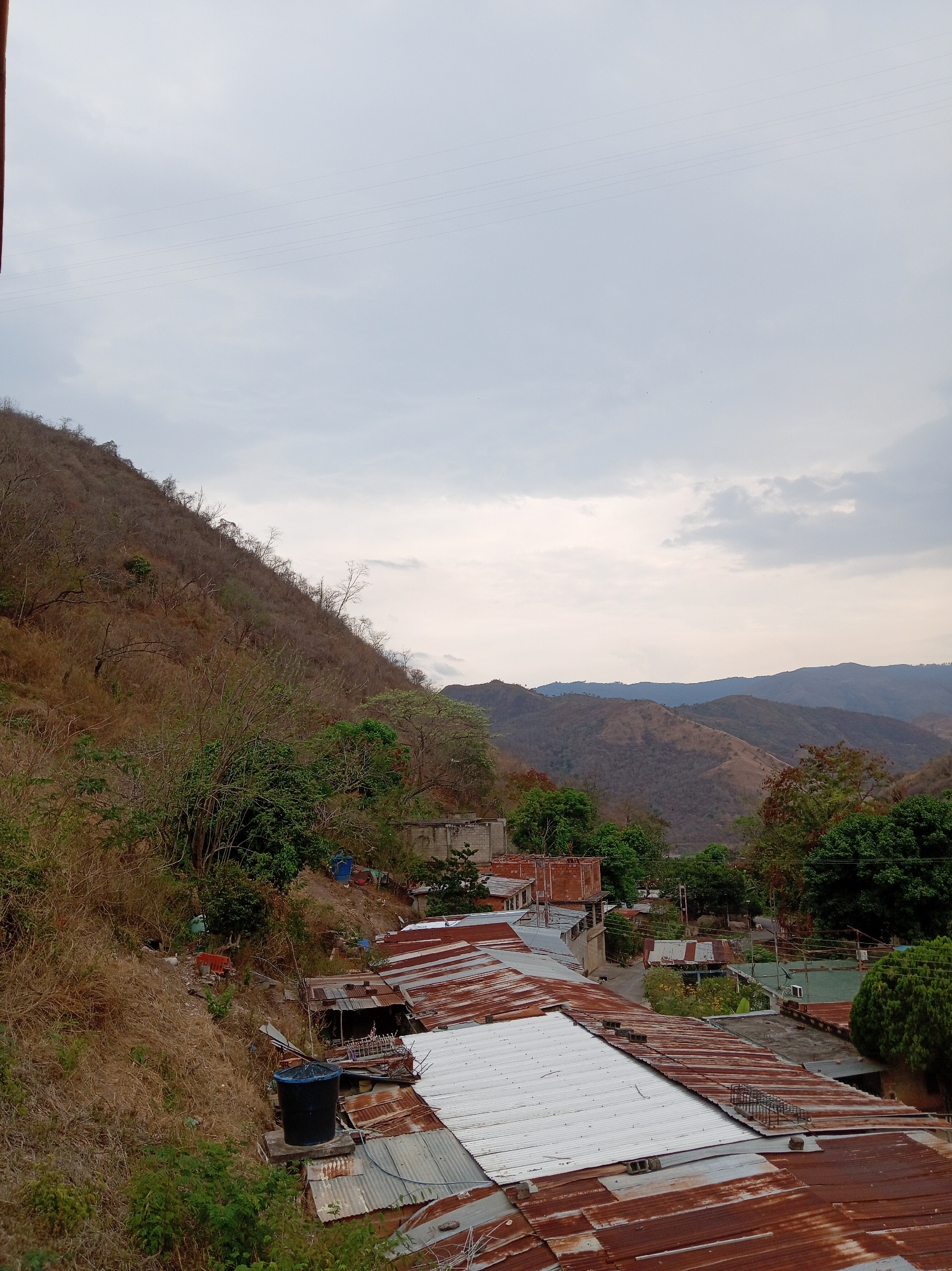 The image depicts a section of the city of Las Tejerías, Venezuela. In the foreground, there is a collection of rooftops constructed from corrugated metal, showing varied levels of rust and disrepair. Some roofs are painted white. A black water tank sits atop one of the rooftops. Adjacent to the roofs is a hillside covered with dry vegetation and scattered trees. A cluster of buildings and trees can be seen in the middle distance. Further in the background, the landscape transitions into a series of mountains under a cloudy sky. Several power lines run across the upper part of the image.