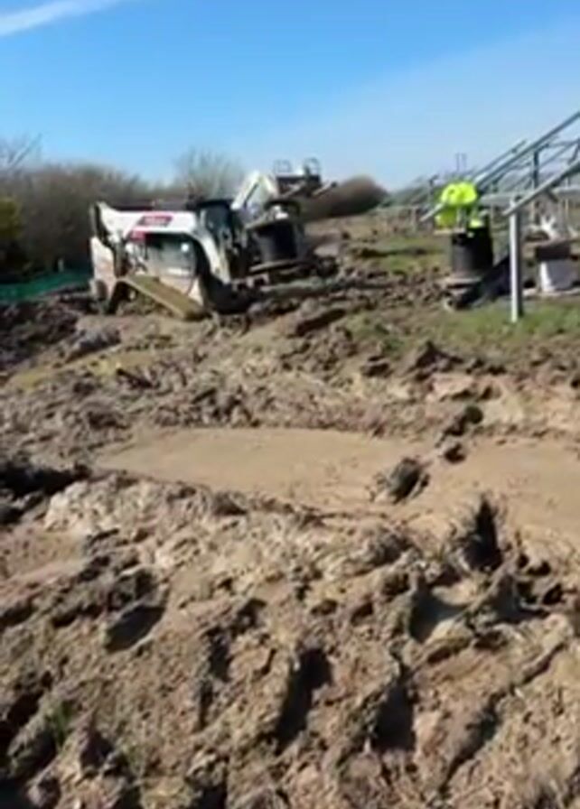 white Bobcat skid-steer loader struggling in thick mud on a construction site. The loader has tracks and is carrying a spool of cable on a pallet attached to its forks. The ground is churned up, and deep tracks are visible. In the background, there is a person in a yellow vest standing near some metal framing structures, presumably solar panel mounts. The sky is clear and blue.