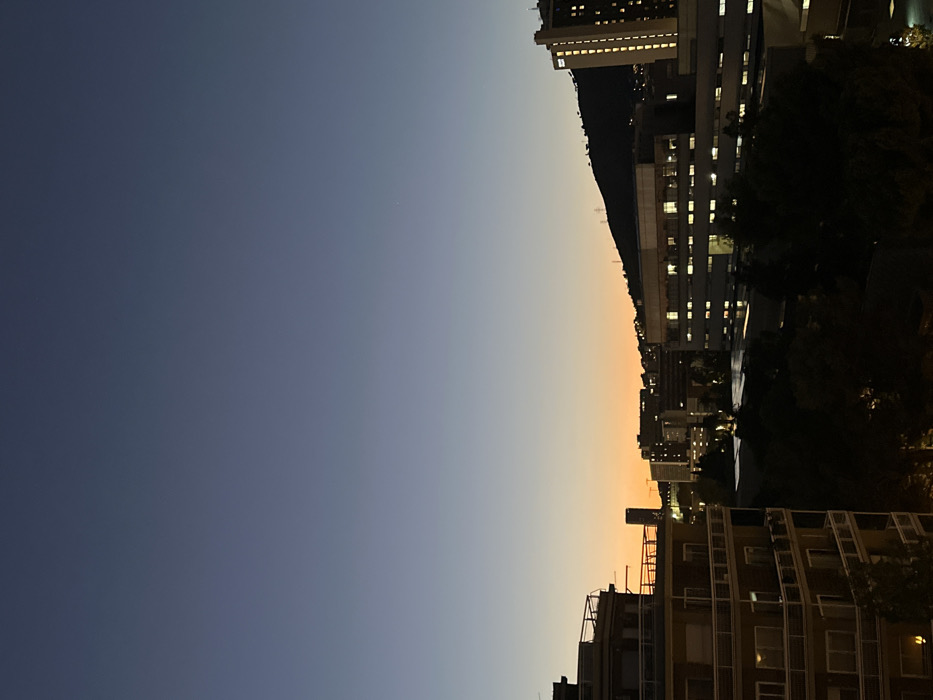 The image displays an urban cityscape at twilight, situated in the city of Unknown, Unknown. The sky transitions from a dark indigo at the top to a bright orange-yellow band along the horizon, indicating sunset or sunrise. A single, faint star-like point is visible in the upper right quadrant of the sky. In the foreground on the left, the upper portion of a multi-story building with curved balconies is partially visible, silhouetted against the lighter horizon, with some internal lights illuminated. The midground features a dense collection of urban structures. Towards the center-left, a tall, slender building with visible lights stands against the horizon. To the right, a prominent, extensive institutional or commercial building complex is visible, characterized by numerous illuminated rectangular windows across its facades. In the background, a large, dark mountain or hill is silhouetted, with faint structures, possibly utility towers, discernible along its upper ridge. Adjacent to the right of the mountain, a tall, multi-story building with numerous illuminated windows is also present, appearing to be part of the larger complex. Dark masses of trees are visible interspersed between the buildings in the lower central area. No individuals are visible in the scene. The primary light sources are the natural gradient of the sky and the artificial illumination from the buildings.