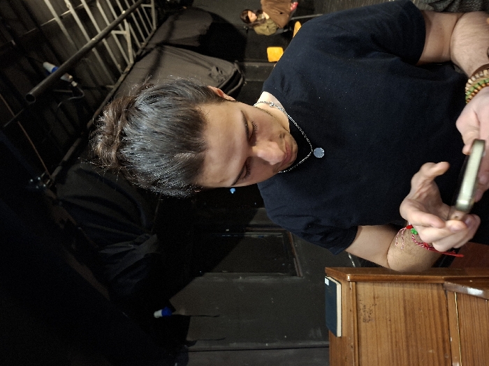 The image displays an indoor scene within a dimly lit performance or rehearsal space in Sofia, Bulgaria. The central subject is a young male, appearing to be in his late teens or early twenties, with dark hair tied into a man bun. He wears a black short-sleeved t-shirt and a silver chain necklace with a circular pendant. His right wrist is adorned with multiple bracelets, including red and white string martenitsa and beaded types. He is positioned slightly to the right, looking down at a light-colored smartphone which he holds with both hands. To the left, a wooden cabinet or piano top is visible, topped with a dark-colored notebook. The background features exposed metal rigging and black fabric drapes, consistent with a stage or theatrical setting. In the mid-ground right, a second individual, with dark hair and wearing an olive-green jacket, is seated on an orange chair, their face partially obscured as they look downwards. The environment suggests a utilitarian, casual atmosphere within a creative or performance venue.
