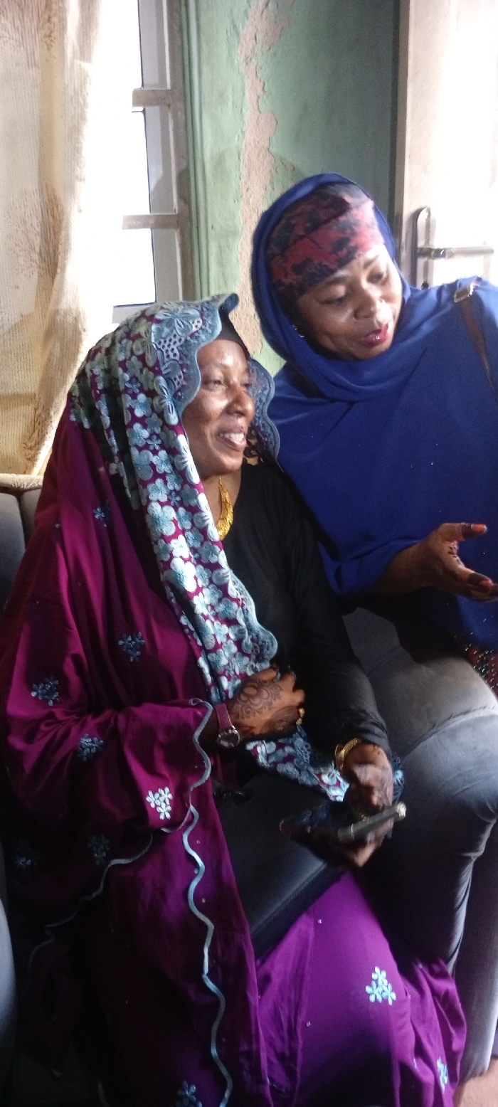 Two adult females are depicted indoors, in what is identified as the city of Dan Maliki, Nigeria. The individual on the left, an older female, is seated, smiling broadly, and looking towards the right. She wears a black top, a gold-colored crescent-shaped earring, and a maroon head covering featuring light blue floral embroidery and scalloped trim. A maroon-banded wristwatch is on her left wrist, and her right hand, adorned with dark henna patterns, holds a black smartphone. The individual on the right, a younger female, is also seated, looking towards the left, and is in the act of speaking or gesturing with her right hand, which also exhibits dark henna patterns. She wears a blue head covering over a patterned red, black, and white undercap, a blue top, and grey trousers. The background includes a window with white framing and light-colored curtains on the left. A section of the wall behind the right individual is light green with visible signs of peeling paint. A dark door or door frame is partially visible to the right of the wall. Both individuals are seated on dark, upholstered furniture.