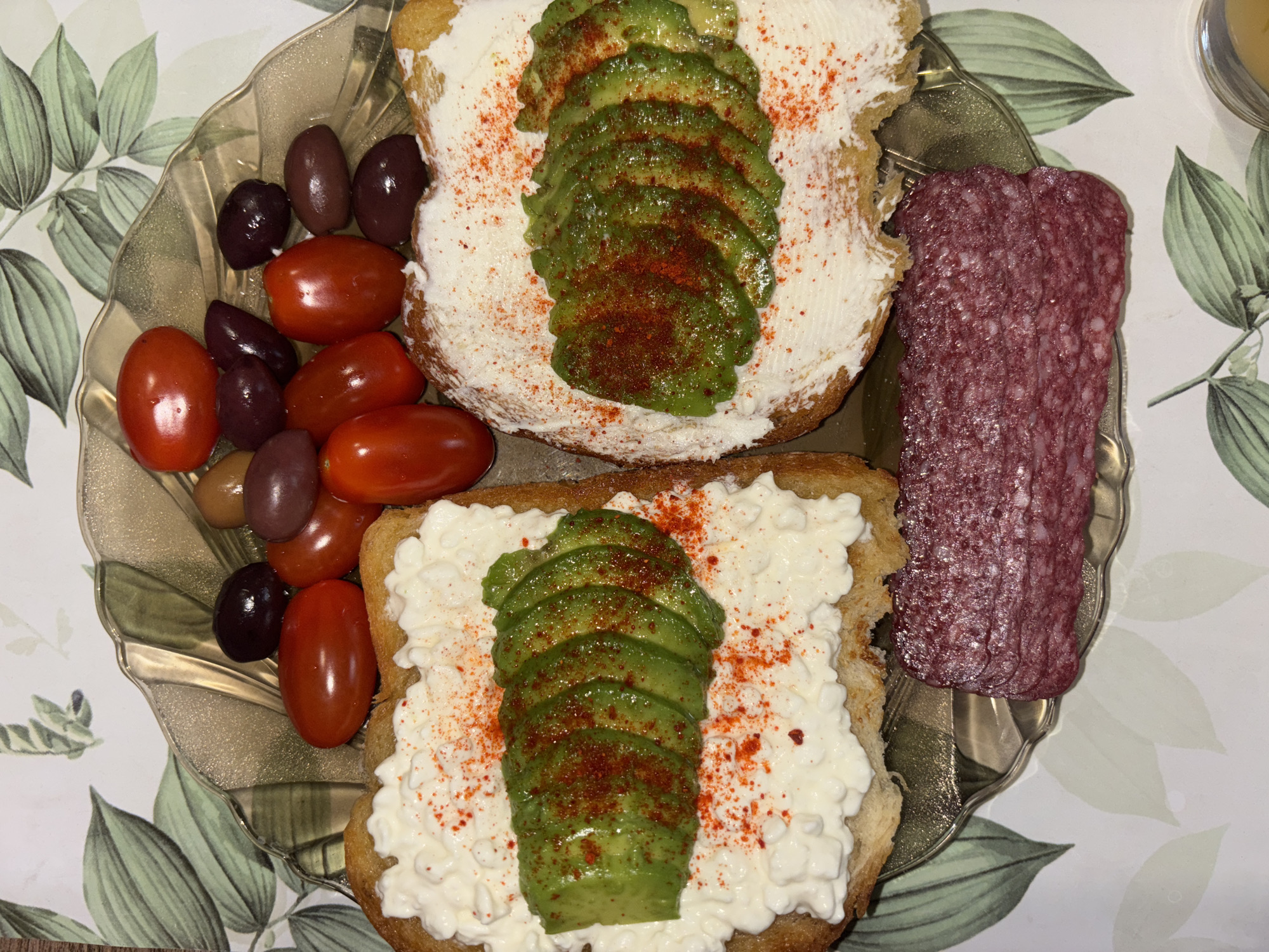 The image displays a close-up, top-down view of a meal arranged on a transparent, amber-tinted plate with a scalloped edge. Two slices of toasted bread are central subjects. The left toast is topped with a white, textured substance consistent with cottage cheese, layered with six thin, fanned slices of green avocado, all sprinkled with red paprika powder. The right toast features a smooth, white spread, also topped with six thin, fanned slices of green avocado and sprinkled with red paprika powder. In the upper portion of the plate, approximately 10-12 whole, red cherry tomatoes are intermixed with about 10-12 whole olives of various colors, including dark black, reddish-purple, and greenish-brown. Below the toasts, partially on the plate and partially extending onto the background surface, is a stack of multiple thin, circular slices of dark red, cured sausage or salami, showing characteristic white fat marbling. The plate and its contents rest on a light-colored surface, likely a tablecloth or placemat, adorned with a repeating pattern of green leaves and branches. The scene is illuminated by an even, overhead light source. There are no individuals present or interactions depicted. No specific location within Sofia, Bulgaria, or any other geographical identifiers, can be determined from the visual content of the image.
