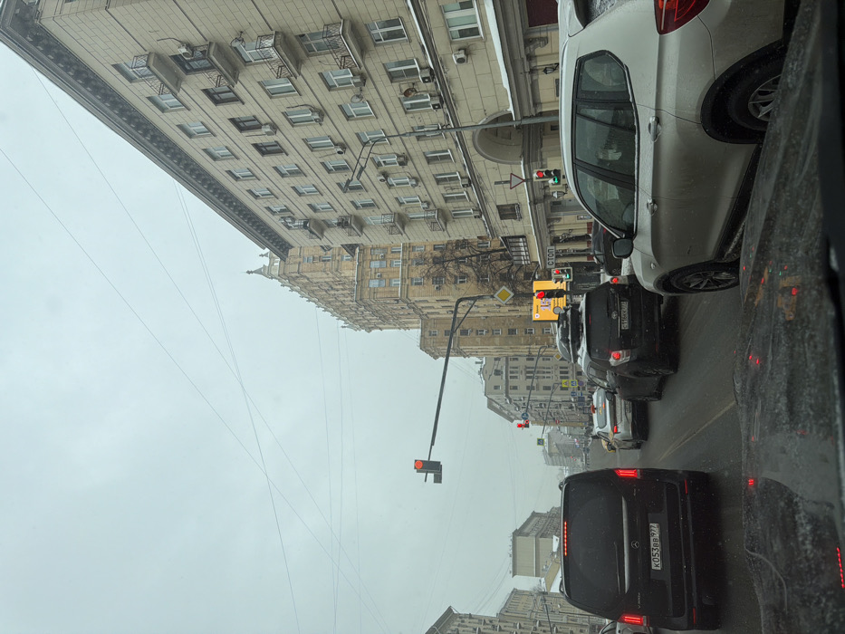 A street scene under a cloudy sky, captured from a car interior. Cars are lined up in traffic. Tall buildings, some with multiple floors and architectural details like balconies, flank the street. A traffic light is visible, along with overhead wires. License plates are partially visible on some of the cars. The image is slightly rotated.