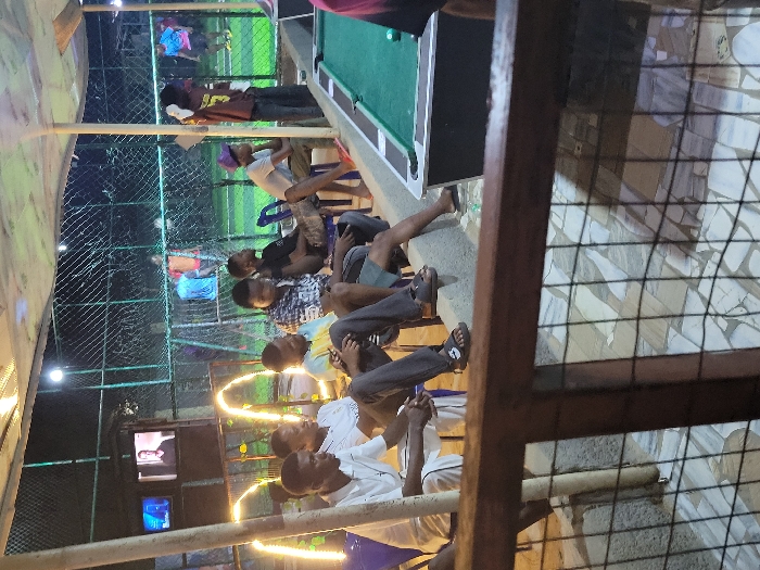 People are seated and watching something on screens near a chain-link fence. One man is standing beside a pool table. The area appears to be outdoors, lit by string lights. Some people are visible in a green field.