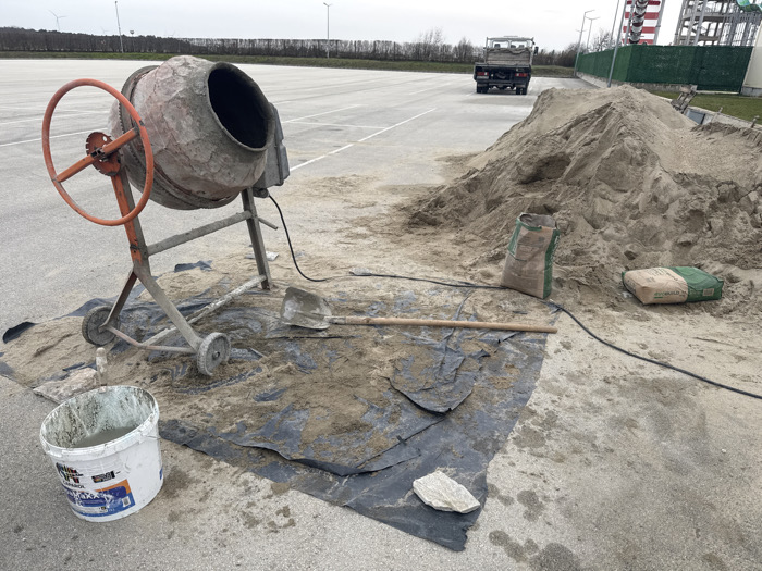 This image displays an outdoor construction or material mixing site in Topola, Bulgaria, under an overcast sky