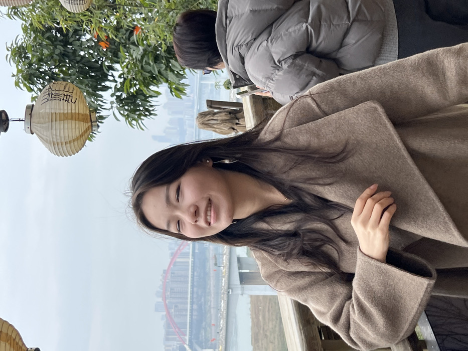 A young woman with long dark hair smiles while wearing a tan coat. A lantern with Chinese characters hangs nearby. A bridge and city buildings are visible in the background. Another person in a gray puffer jacket stands behind her. The scene appears to be outdoors, possibly at an elevated location.