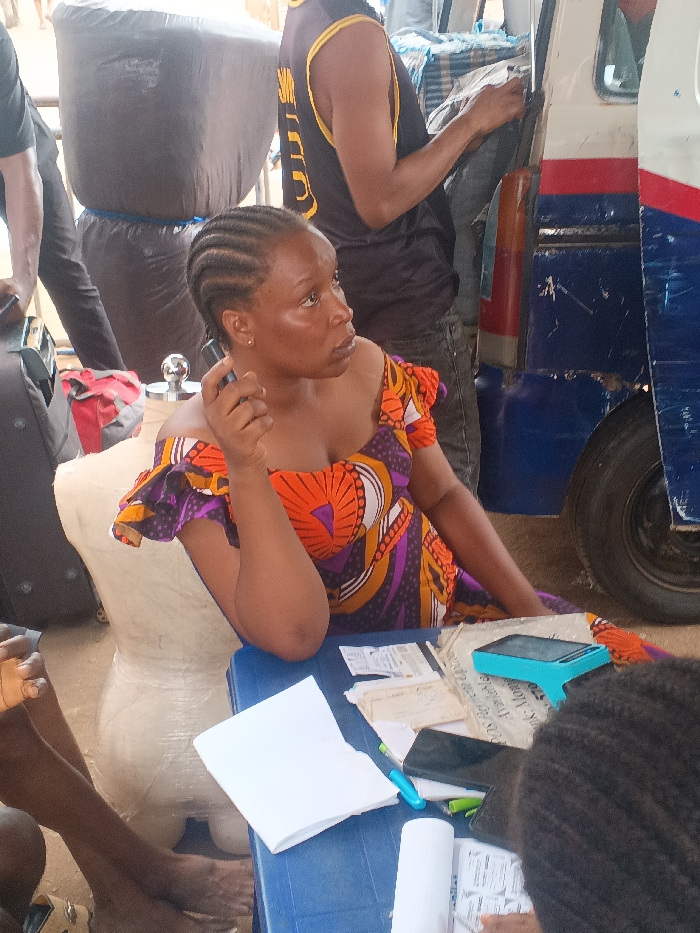 A woman with braided hair sits at a blue table wearing an orange and purple dress. She holds a small object near her ear and looks off to the side. The table has papers, a calculator, a phone, and a pen on it. Behind her is a white object wrapped in plastic and a vehicle with blue, white, and red stripes. A man in a black and yellow jersey stands near the vehicle, and people are visible in the foreground and background.