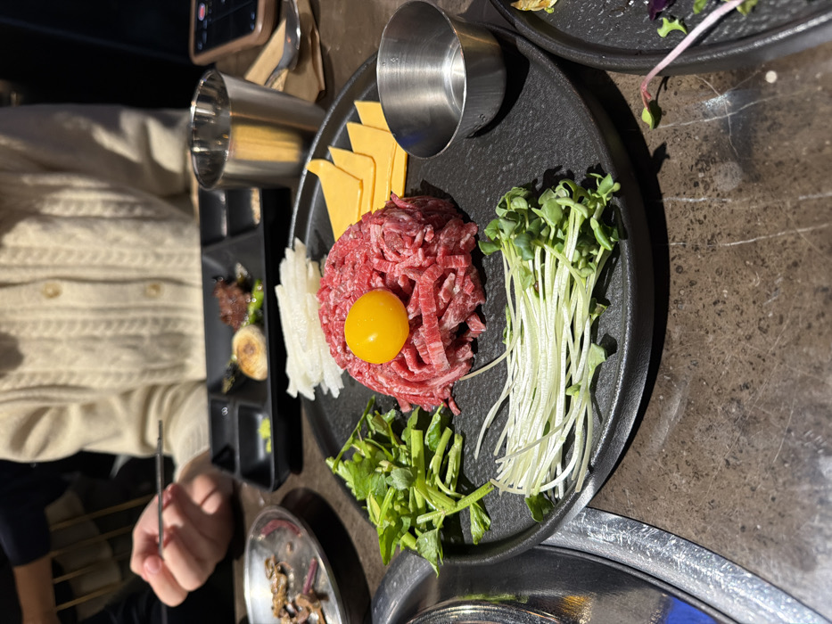 This image captures a close-up view of a dining table within a restaurant in Seoul, South Korea. The central subject is a black, textured circular plate presenting a mound of deep red, thinly sliced raw beef (yukhoe), centrally topped with a single, vibrant orange raw egg yolk. Surrounding the beef are arranged accompaniments: a segment of thinly julienned white radish, a fan of four triangular slices of orange cheese, a pile of fresh green leafy vegetables, and a separate cluster of white sprouts. An empty small, round metallic dish rests on the right side of this plate. The table surface is dark with a polished, speckled appearance. To the far left, a portion of a circular metal grill, indicative of a Korean barbecue setting, is visible, alongside a small, partially cleared metallic plate containing food remnants. In the blurred background, a person wearing a cream-colored cable-knit sweater is seen holding silver chopsticks over a black rectangular partitioned plate, which contains various small side dishes, including a grilled mushroom, what appears to be cooked meat, and green vegetables. A silver metal drinking cup stands on the right side of the table, adjacent to a smartphone with a dark casing. The ambient lighting is dim, consistent with an indoor restaurant environment.