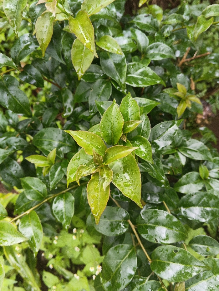 The scene depicts a close-up, high-angle view of dense green foliage, consistent with an outdoor natural environment in Keo Kouang, Laos. The primary subjects are numerous leaves in various shades of green, ranging from vibrant light green on new growth at the center to darker, more mature green on surrounding leaves. The leaves are visibly wet, covered with numerous small water droplets, indicating recent precipitation or dew. The texture of the leaves appears smooth and glossy in areas where water reflects light. No individuals, animals, or man-made objects are present in the frame. The background consists of further blurred green foliage and hints of darker soil or deeper shadows. No specific actions or interactions are occurring.