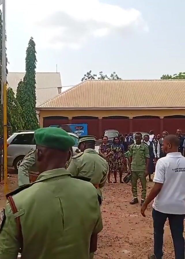 group of uniformed officers, likely in a ceremonial setting, standing in a yard with a flagpole. Several of them wear green uniforms and berets. A building is visible in the background, and there are other people, some in civilian clothing, standing around the perimeter. Some of the officers are holding what appear to be religious texts. The ground is reddish dirt and appears to be littered with leaves. The video appears to be taken from the perspective of someone standing within the group of officers.