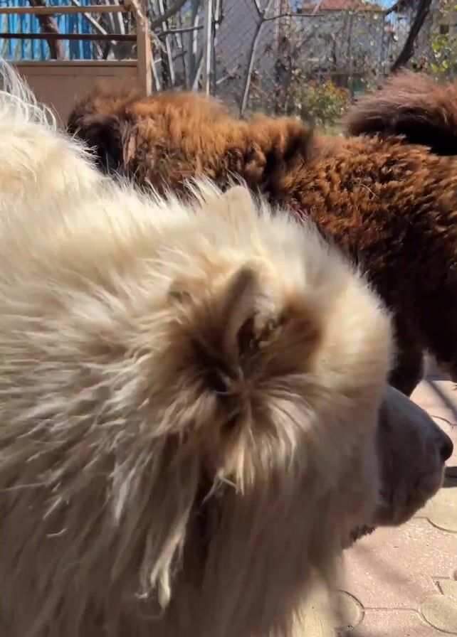 - "Two chow chow dogs, one white and one brown, are standing on a tiled patio in a backyard on a sunny day" by FM-fG1FF3, licensed under CC BY 4.0