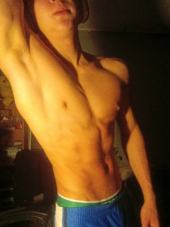 A shirtless man poses in a dimly lit room, showcasing his physique. Defined abdominal muscles and a strong upper body are visible. He is wearing blue shorts with a green waistband. The background is mostly dark, obscuring details, but a shelf with items is seen on the left. One arm is raised, revealing his armpit.