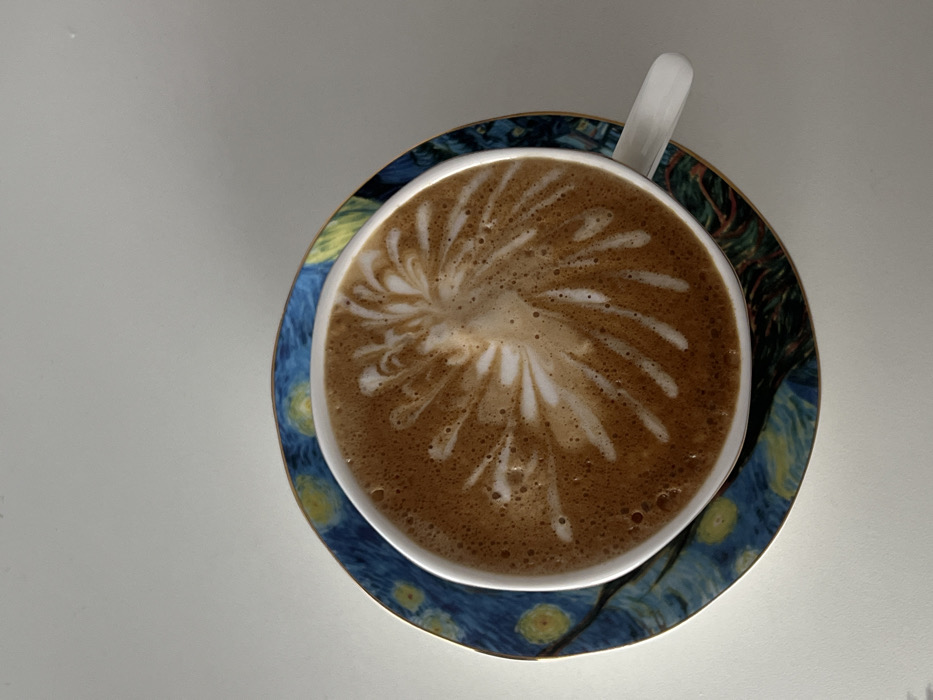 - "A top-down forensic image depicts a white ceramic coffee cup filled with a light brown beverage topped with elaborate white latte art, resembling a stylized explosion or starburst pattern, centered in the liquid" by FM-XmLYN2, licensed under CC BY 4.0