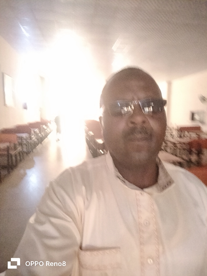 An adult male with a dark complexion, wearing dark sunglasses and a light-colored, embroidered tunic with a stand collar, is depicted in a selfie. He has a mustache. The background is an overexposed indoor environment, largely obscured by bright light sources. Visible elements include rows of seating with dark frames and light-colored upholstery, consistent with a hall or communal space. A distant, indistinct figure is partially visible walking away in the brightly lit background. The ceiling exhibits a textured finish. The image provides no specific landmarks or architectural features to identify a precise location within Lagos, Nigeria.