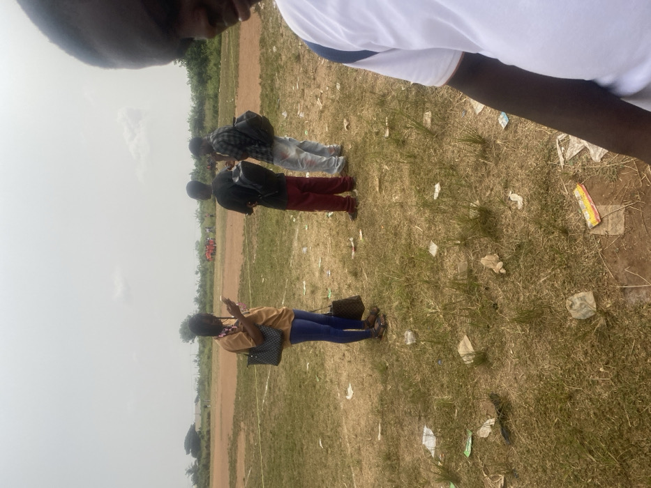 The image depicts an outdoor scene in Igbesa, Nigeria, under a bright, overcast sky. The ground is a mix of dry, sparse grass and reddish-brown dirt, heavily littered with various pieces of trash, including plastic wrappers and paper. Four individuals are present in the foreground and midground. On the left, a woman with braided hair, wearing a tan long-sleeved top, blue trousers, and sandals, stands holding a white smartphone with both hands, looking down at it. She carries a dark patterned shoulder bag and a smaller dark patterned handbag. To her right, a man wearing a dark t-shirt, red trousers, and a black backpack stands with his back mostly to the camera, observing the distant background. Adjacent to him, another man wearing a dark plaid shirt, light-colored jeans with visible marks, and a black backpack also stands with his back partially to the camera, appearing to hold a phone to his right ear. In the extreme foreground on the right, the right shoulder and part of the head of a fourth individual, wearing a white t-shirt with a dark shoulder stripe, are visible, indicating their proximity to the camera. In the far background, beyond a line of sparse vegetation, a dirt field is visible, where a group of individuals in red or orange clothing are gathered, suggesting an event or activity. A faint, light-colored line or rope extends horizontally across the midground on the dirt.