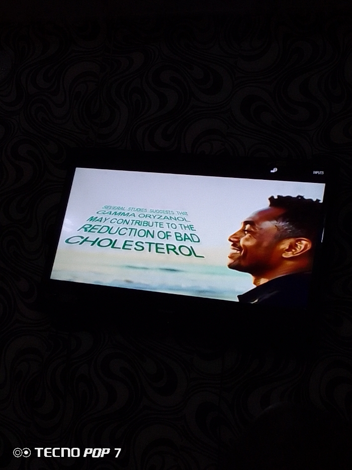 The scene depicts an electronic screen displaying informational content within a dimly lit indoor space. The screen occupies the central area of the frame, showing a smiling dark-skinned male in profile on the right, looking left. He has short, dark, curly hair and wears a dark garment. Text on the left side of the screen, in white and green, reads: 'SEVERAL STUDIES SUGGESTS THAT GAMMA ORYZANOL MAY CONTRIBUTE TO THE REDUCTION OF BAD CHOLESTEROL'. A light blue horizon line suggesting water is visible beneath the text and behind the male subject. Small white icons, including a circular symbol and the word 'INPUTS', are present in the screen's top right corner. The background surrounding the screen features dark wallpaper with a repeating pattern of grey, abstract, swirling designs. The image contains a 'TECNO POP 7' watermark in its lower-left corner.