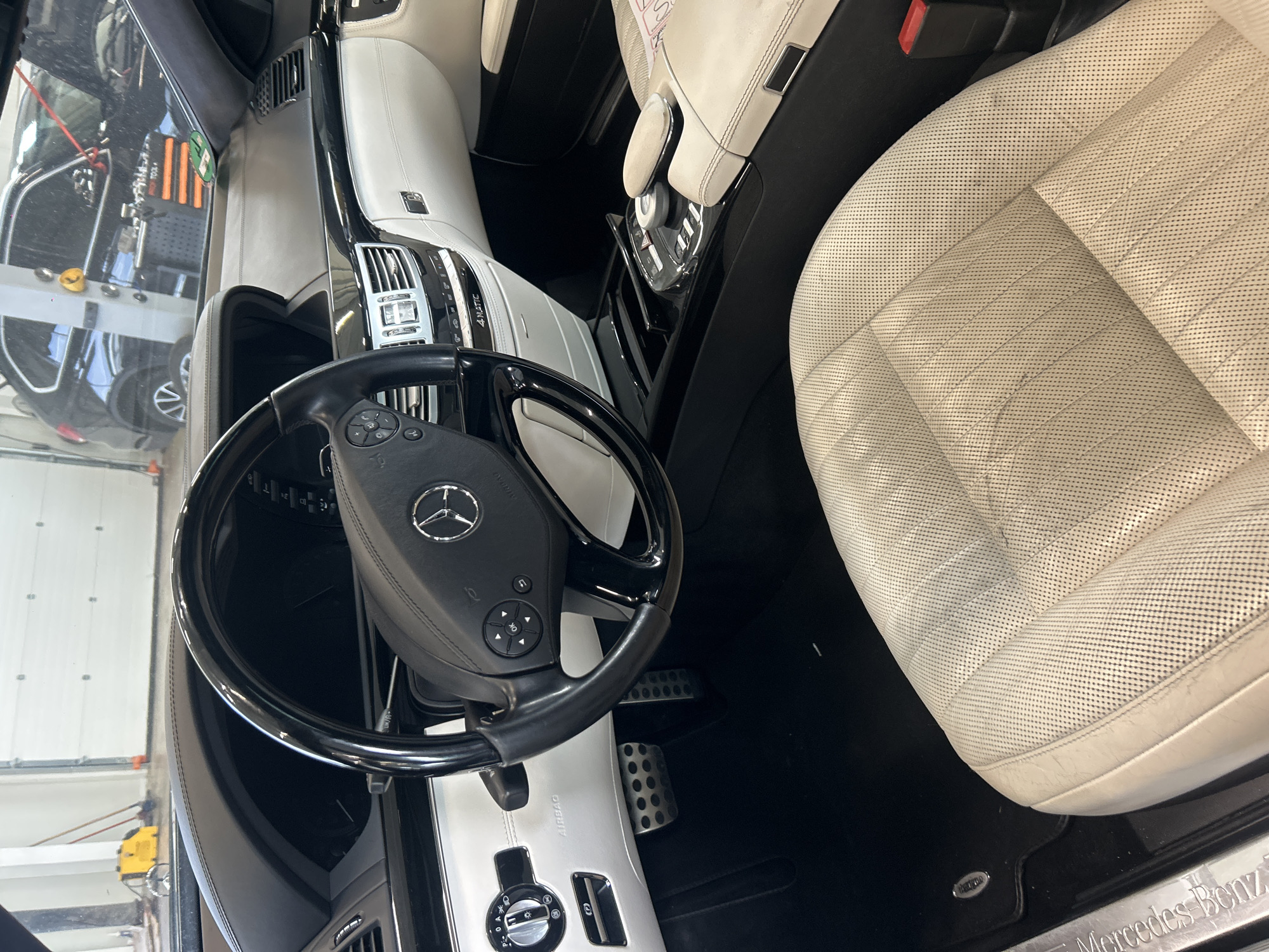 interior of a Mercedes-Benz car. The interior features a black and white color scheme with white leather seats and a black steering wheel with the Mercedes-Benz logo. The dashboard is a combination of black and white, with silver accents. The floor is black. The image appears to have been taken in a garage or workshop setting, visible through the car's windows. The location in Tsaratsovo, Bulgaria, cannot be confirmed based on the visual information provided.