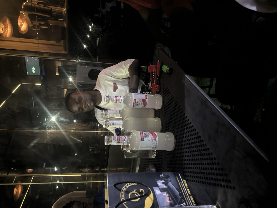 This image captures a nocturnal scene within an establishment located in Ikeja, Nigeria, likely a bar or lounge, characterized by a glass partition and artificial lighting. A male individual, appearing to be in his twenties, with short dark hair, is prominently seated behind a dark, perforated rectangular table. He wears a light-colored short-sleeved t-shirt featuring a small red design on the left chest and has a dark strap, possibly from an apron or bag, over his left shoulder. He is observed looking slightly to his left with a subtle smile, his forearms resting on the table. On the table, five clear glass bottles containing a pale, translucent liquid are arranged; four are distinctly labeled "SMIRNOFF ICE" with red branding. An empty clear drinking glass is positioned near the bottles. To the right, a set of red and metallic bar tools, including a corkscrew, and a green cigarette lighter are visible. On the far left of the table, a dark paper bag with a gold "OG" logo and the text "ATUNDE GADGETS" and "QUALITY NICE, NOT TWICE" is present, showing an image of electronic devices. The glass partition behind the seated male reflects overhead decorative light fixtures and shows faint reflections of other individuals, including a partial view of a head and shoulder on the left. Beyond the glass, an urban exterior is indicated by visible streetlights and vehicle headlights. A screen displaying "Matula" is mounted on the wall in the background. A person's right arm, clad in a reddish sleeve, is partially visible on the right side of the table, indicating another occupant.