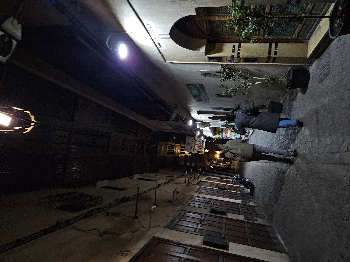 A narrow, dimly lit street scene shows two people walking along a cobblestone path. One is wearing a long dark coat and blue jeans, the other a lighter jacket and gray pants. Shop fronts with closed doors and window grates line one side of the street, with various wires and poles. Overhead lights illuminate the scene. A plant in a pot sits outside a building. The image has a slightly disorienting perspective.