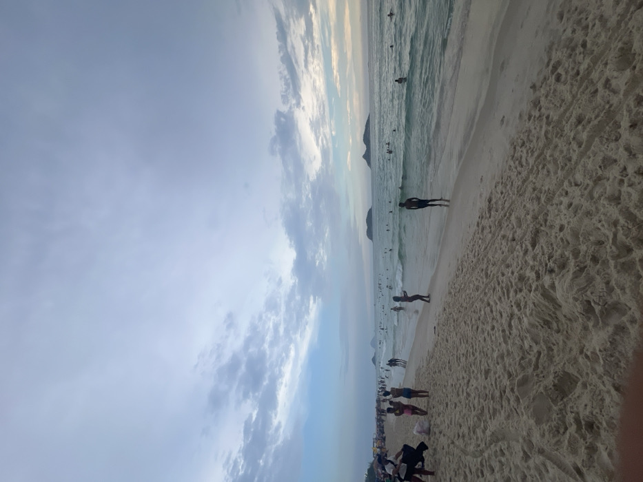 A beach scene under a cloudy sky. People are enjoying the ocean, with some swimming and others walking along the shore. The beach is crowded, with people gathered in groups closer to the foreground. The sand is light in color, and the water is a mix of green and blue. A few land masses are seen in the distance within the ocean.
