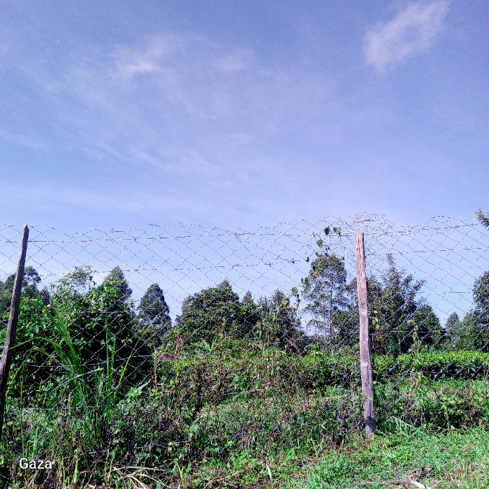 The image displays an outdoor landscape in Bonyamaro ward, Kenya. The upper half of the frame shows a clear light-blue sky with sparse, wispy white clouds. A wire mesh fence, exhibiting a diamond pattern, traverses the mid-ground horizontally. This fence is supported by two rough-hewn wooden posts; one is partially visible on the far left, and another stands upright slightly to the right of the frame's center. Green vines are observed growing through the fence mesh, particularly near the central post. The lower half of the image foreground consists of dense, varied green vegetation, including grasses and shrubs, both in front of and immediately behind the fence. Beyond the fence, a line of tall, dark green trees, consistent with evergreen or coniferous species, forms a prominent background feature. To the far right, a cultivated field with uniformly short green plants is partially visible behind the tree line. No individuals, animals, or constructed buildings other than the fence are present. The word "Gaza" is inscribed in white text on the bottom-left corner of the image.