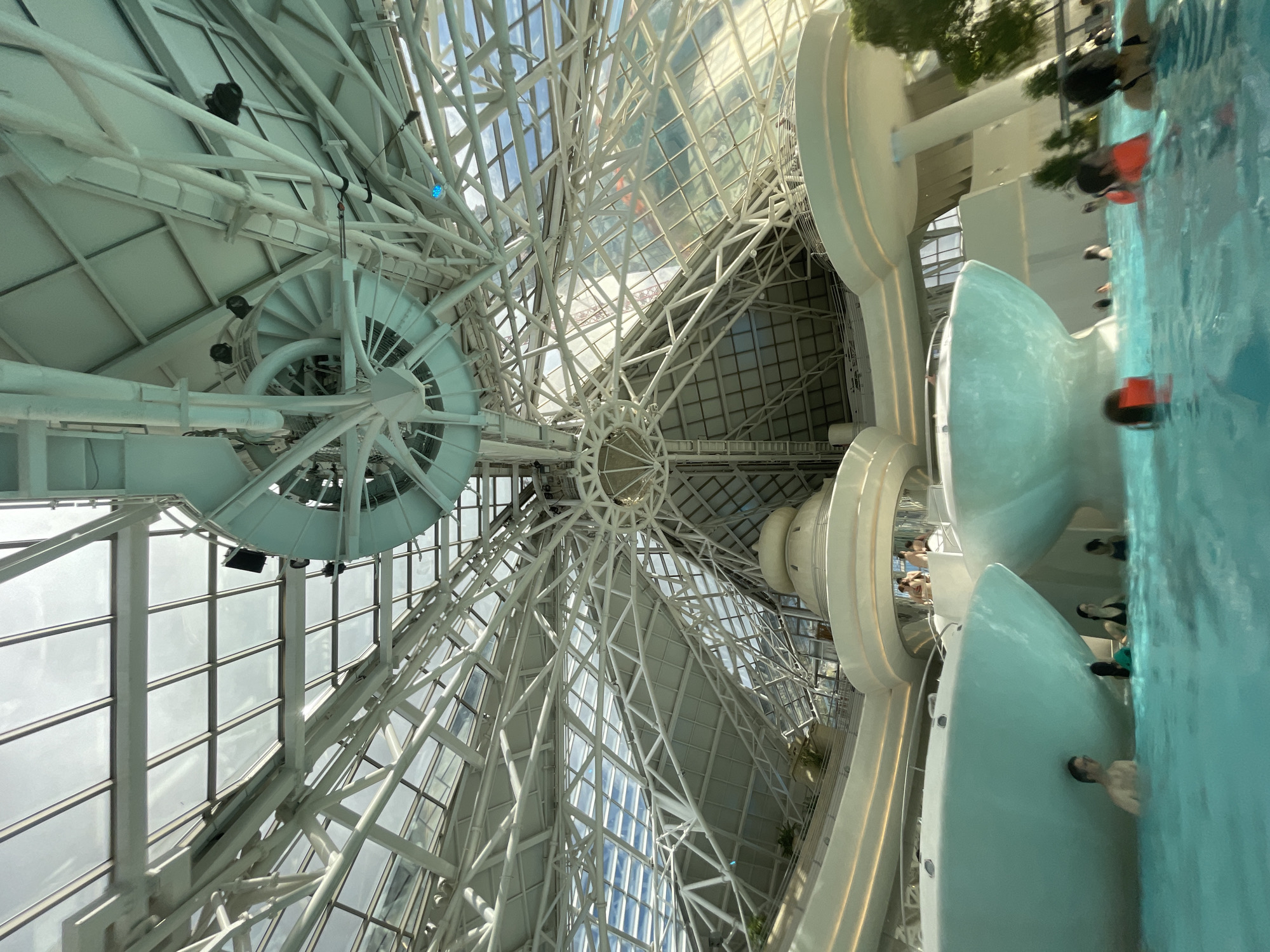 The image captures the interior of Caldea, a thermal spa located in Les Escaldes, Andorra. The focus is on the building's architecture, with a view looking upward towards the structural framework of the roof. The roof is a network of white steel beams and glass panels, creating a complex geometric pattern against the sky. A circular architectural element is seen on the left side, near the beams. On the right side of the image, parts of a swimming pool area are visible, with people swimming. The image is rotated, giving a tilted perspective of the scene.